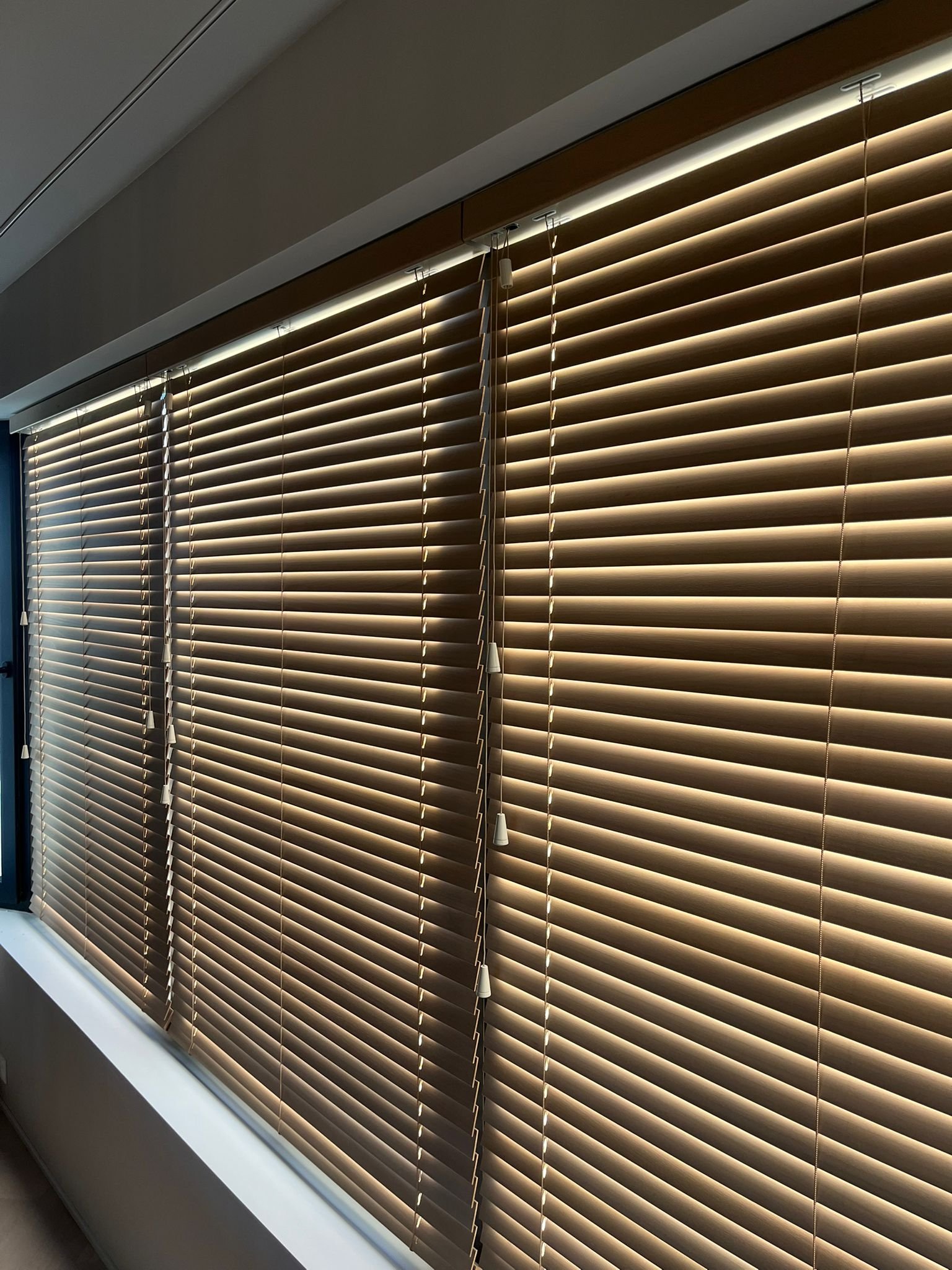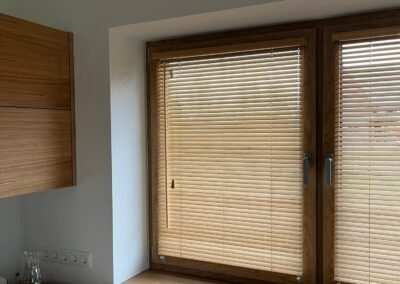 Koka žalūzijas nodrošina precīzu gaismas kontroli, kas samazina atspīdumu uz ekrāniem un rada patīkamu darba vidi.